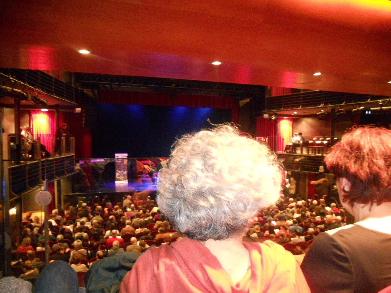 Me detuve un par de minutos a recoger un aparato de traducción simultánea (la entrevista iba a ser en italiano) y entre en la sala que ya conocía ya que había acudido a ver Enrique VIII unos meses atrás. Pronto comprendí que la primera planta estaba llena al 100 % así que subí a la primera planta y conseguí asiento en la segunda fila. Miré el reloj, eran las 15:45 y la charla debía empezar a las 16:30. Miré a mi alrededor, los asientos iban siento ocupados y los que no encontraron sitio en la segunda planta subieron a la tercera. No sé de cuanto es el aforo de la sala Barts, pero a ojo calculo que cerca de mil personas habían acudido a escuchar a Camilleri.A las 16:40 empezó y duró hasta las 18:00, seguramente nadie hubiese protestado por una duración más larga por lo bien que se expresa Camilleri y lo ameno de la charla pero también se debe tener en cuenta que Andrea tiene 88 años y debía coger un avión hoy sábado para volver a Roma.